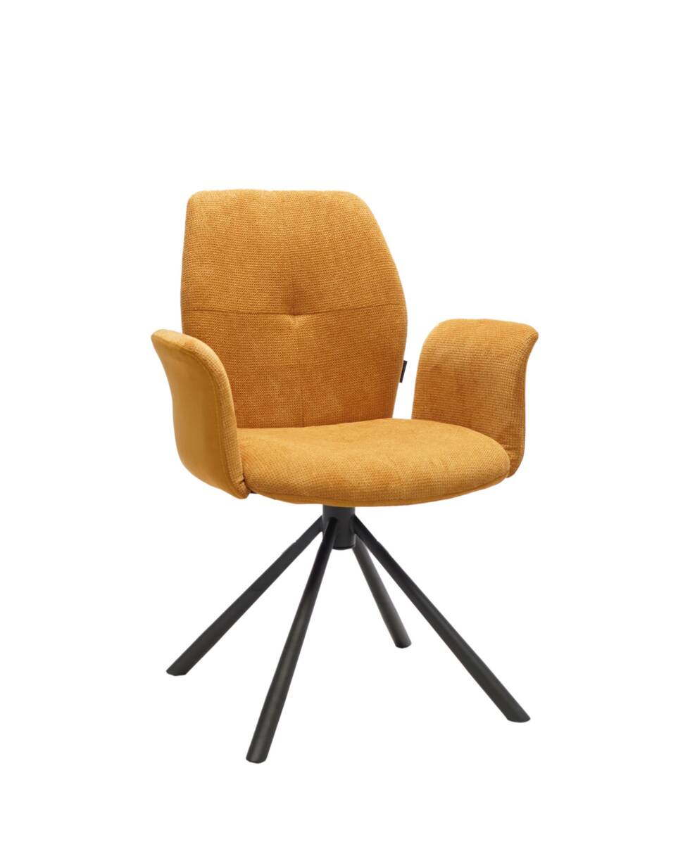 Erleben Sie den Armlehnstuhl MANOA von Louming in einem modernen Stil, der durch seine senfgelbe Stoffpolsterung zum Blickfang wird.