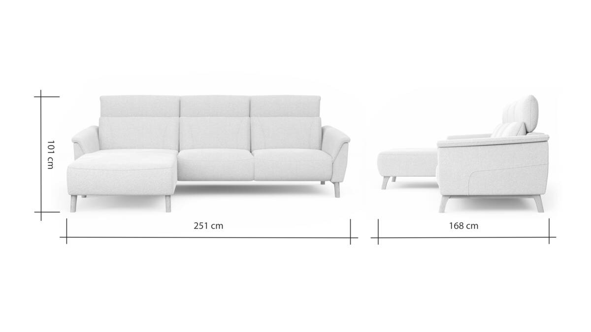Ecksofa Nevin - Longchair links mit 2-Sitzer rechts, inkl. Kopfpolsterverstellung, Stoff, Weiß