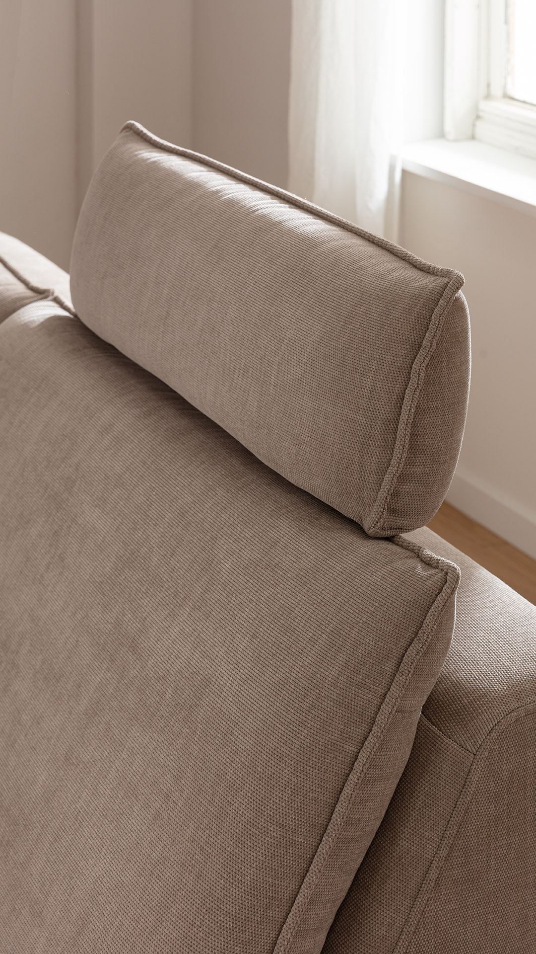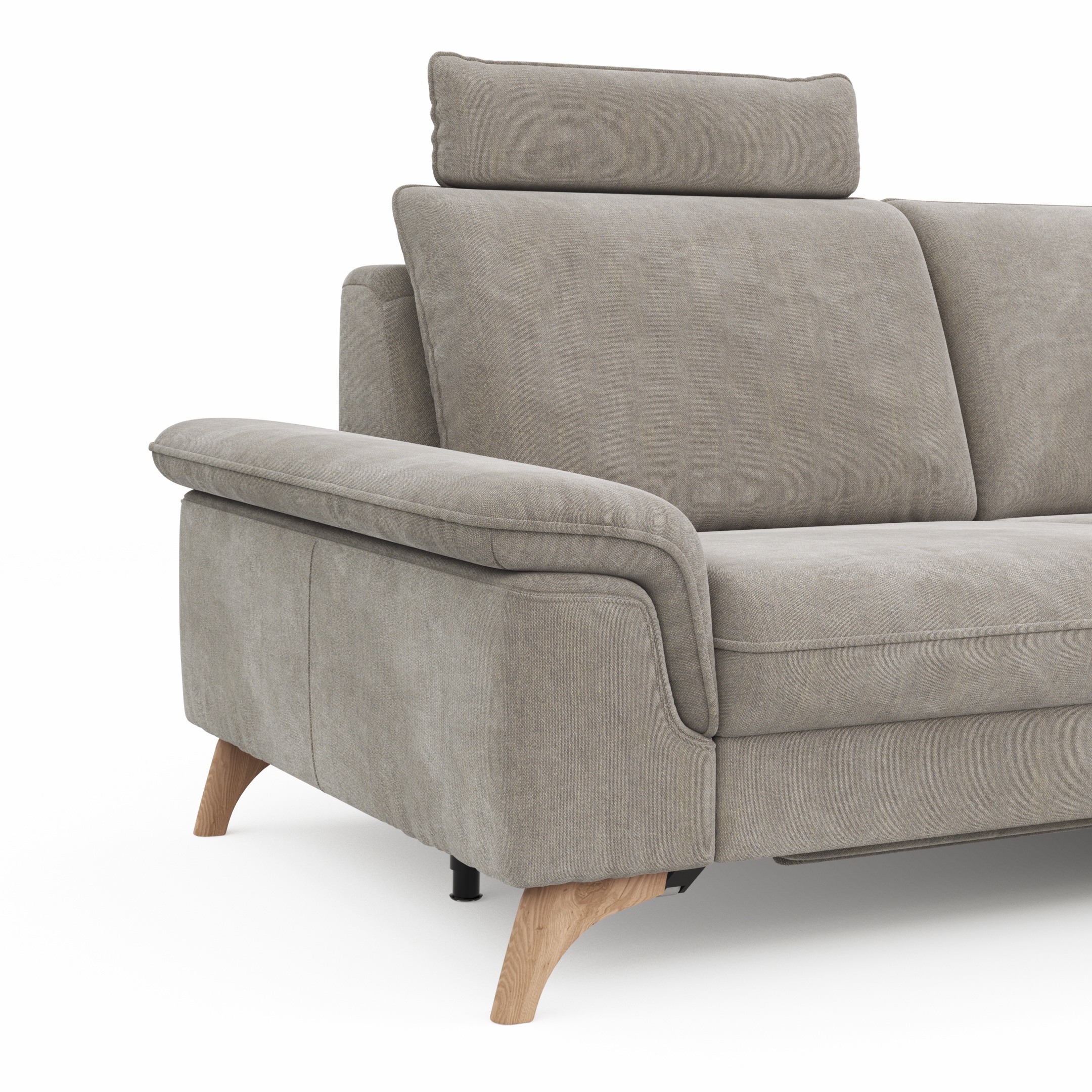Das Ecksofa Tulsa KS von Natura Home präsentiert sich in einem eleganten und naturverbundenen Design. Mit hochwertigem Stoff in Graubeige ind bequemer Polsterung bietet es einen hohen Sitzkomfort. Die massiven Wildeiche-Füße in Winkelform unterstreichen den klassischen Stil. Die 2,5-Sitzer-Konfiguration mit Spitzecke und aufklappbarem Anstellhocker auf der rechten Seite sowie verstellbare Armlehnen und Schlaffunktion machen es besonders vielseitig. Weitere Konfigurationsmöglichkeiten, wie verschiedene Farben und Materialien, sind im lokalen Möbelhaus verfügbar.