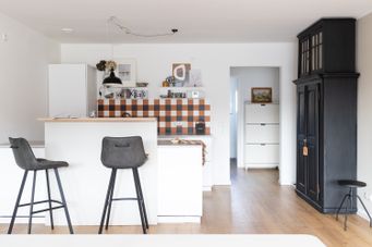 Unsere Bar ist etwas höher geworden als geplant, um auf der Rückseite zum Herd eine 30 cm hohe Fliesenwand anzubringen. Wie auch hinter dem Waschbecken auf der gegenüberliegenden Seite der Küche, habe ich dafür die Fliesen von Click’n’Tile verwendet. Das innovative Fliesenkonzept aus Dänemark aus recycelten Kunststoffkacheln lässt sich ganz einfach auf einer Wandplatte anbringen.