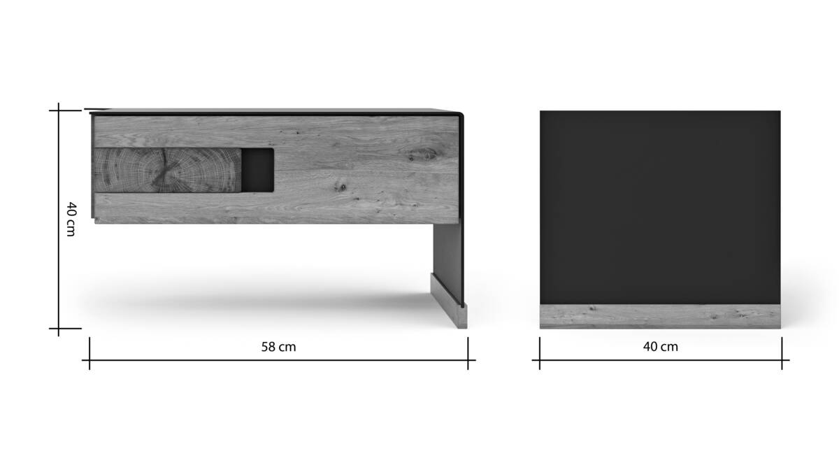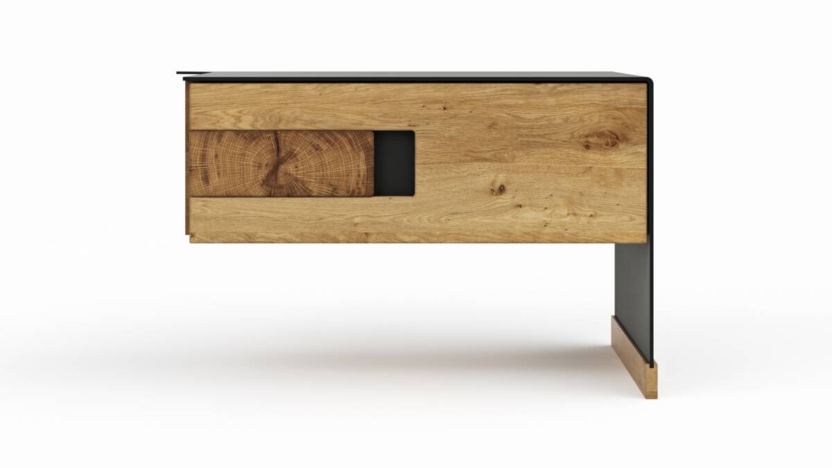 Mit ihrer Front aus massiver Wildeiche wirkt sie rustikal, aber durch ihren schwarzen Metallkorpus zugleich auch sehr elegant. Die grifflose, gedämpfte Schublade schließt fast lautlos, so dass beim Zumachen niemand durch unangenehme Geräusche geweckt wird.