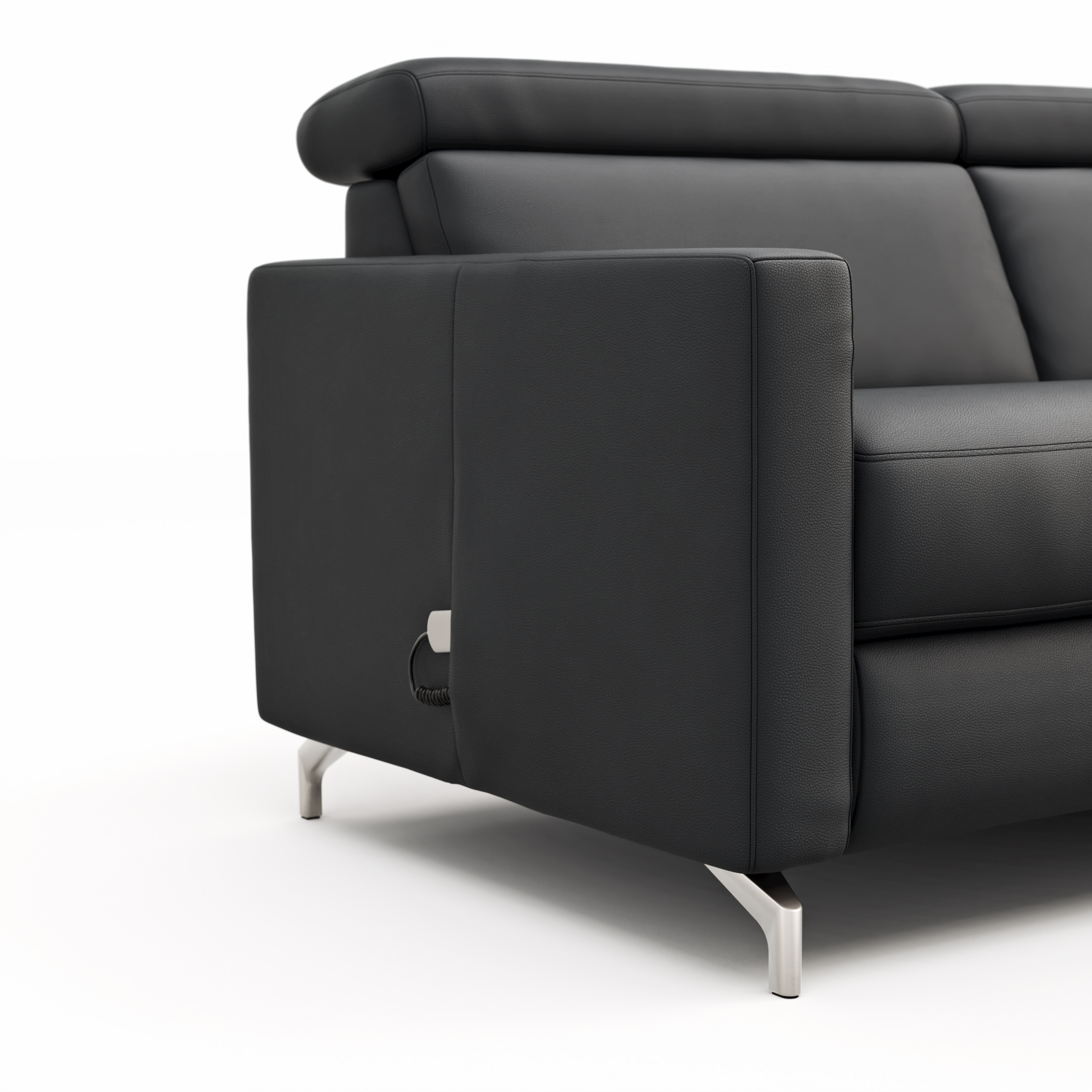 Dieser 2-Sitzer kombiniert elegantes Design in Schwarz mit hochwertigem Leder und bietet Ihnen dank der motorisch verstellbaren Relaxfunktion und eines verstellbaren Kopfteils optimalen Komfort. Die Sitzhöhe von ca. 46 cm sorgt für ein angenehmes Sitzgefühl, während die stilvollen Füße aus Metall in Nickeloptik und in Winkelform dem Sofa eine moderne und stabile Basis verleihen.