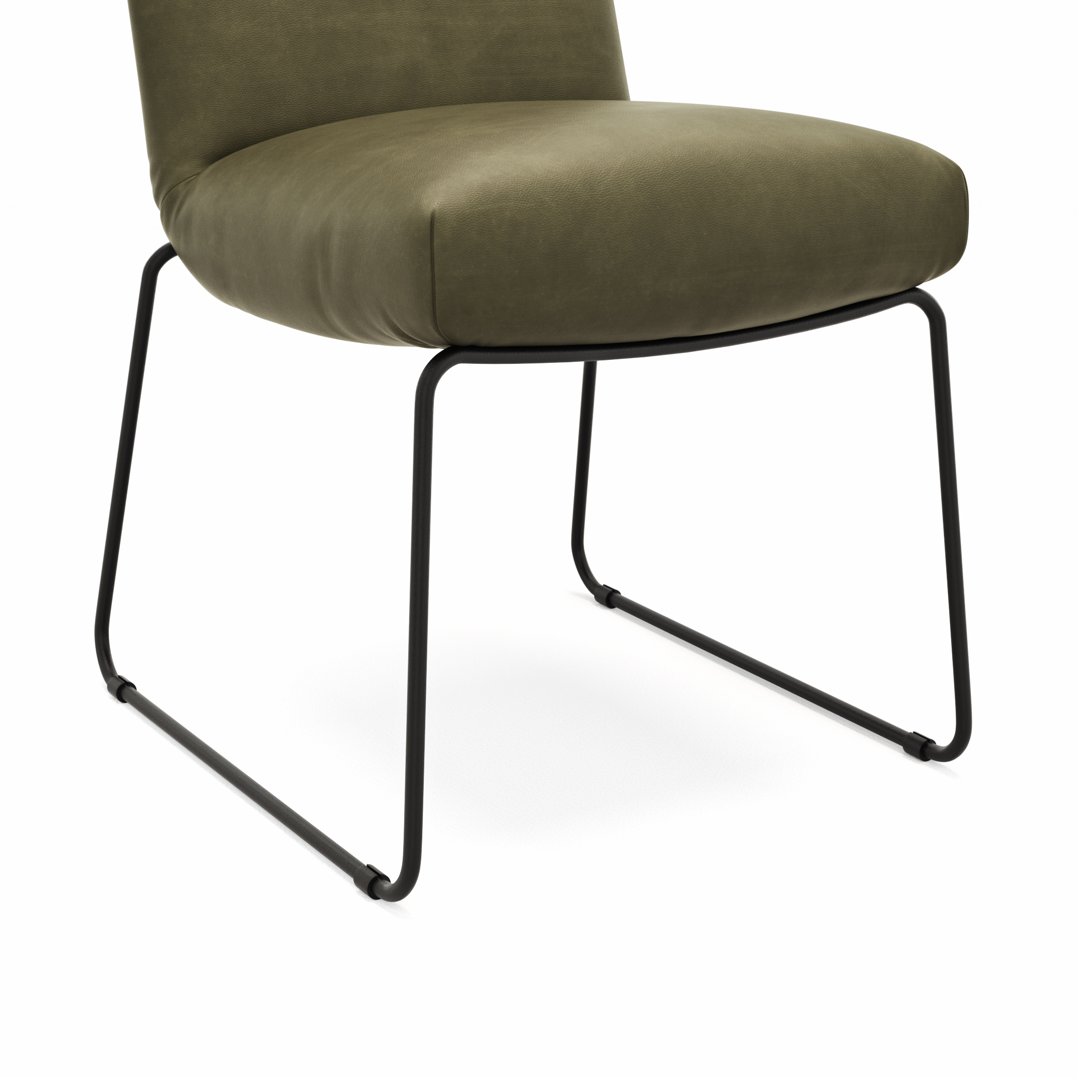 Mit seinem modernen Stil, der sich in jedem Raum hervorragend einfügt, besticht er durch sein edles Leder und seine attraktive Farbgebung Olive. Das Gestell ist in Anthrazit gehalten und besteht aus robustem Metall in Kufenform. Für optimalen Komfort sorgen die Schaumstoff-Sitzfläche und die Schaumstoff-Rückenlehne.
